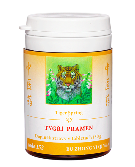 Popis dle TCM - Jedná se o modifikaci originální tradiční čínské bylinné směsi BU ZHONG YI QI WAN, která je upravena na dnešní poměry. Tato směs je určena pro stavy nedostatečnosti energie čchi sleziny a žaludku PI/WEI QI XU, které vedou k oslabení a poklesu jang YANG XU XIAN. Dle čínské medicíny střední ohniště ZHONG JIAO (slezina PI a žaludek WEI) produkuje z potravy a vzduchu energii čchi QI a krev XUE. V případě oslabené funkce těchto orgánových drah dochází k nedostatečné tvorbě energie čchi QI XU a krve XUE XU a poklesu jang YANG XU XIAN. To vše se pak projevuje celkovou slabostí, která je způsobena buď vrozenou slabou konstitucí nebo následuje po dlouhodobé nemoci. Tato slabost se manifestuje ve 3 různých polohách: 1. pokles a výhřez konečníku, dělohy, močového měchýře, varixy, kýly a hemeroidy. 2. chronický průjem (bez bakteriálního nálezu) či řídká stolice s nestrávenými zbytky. 3. anémií u žen, které mají špinění mezi menses či které mají častou menstruaci, opakované potraty. Dle čínské medicíny energie čchi sleziny PI QI řídí a vyživuje svaly a končetiny, obzvláště pak od pasu dolů. Proto i nedostatečná funkce sleziny PI QI XU se projeví zhoršenou výživou končetin, která vede k pocitu slabosti a tíhy v končetinách. Pokud se tedy oslabí energie čchi sleziny PI QI XU, tak nedochází pak k vzestupu energie jang YANG do povrchových vrstev, kde nemá dostatečnou sílu na cirkulaci. Objeví se přerušovaná horečka (zhoršená po námaze), spontánní pocení (typicky zhoršená po námaze) a odpor k chladu - zimomřivost, která se zlepší oblečením (při napadení zevním chladem naopak nedochází ke zlepšení po oblečení). Díky oslabené jangové energii YANG XU se zhorší i cirkulace tekutin, což se projeví žízní s chutí na horké nápoje (při horku z nedostatečnosti RE XU se objevuje naopak žízeň na studené nápoje). Nedostatečnost energie čchi PI QI XU se dále projeví chronickou únavou, krátkým dechem a snadným zadýcháním i po malé fyzické námaze, nechuť mluvit, zpomalené řeči, nechuť se pohybovat, lesklému a bledému obličeji a kůži či opakovanému krvácení z nosu. Tygří pramen je vhodný i pro sportovce, jež potřebují ke svým výkonům jakýsi fyziologický doping, neboť přirozeným způsobem zvyšuje energetické schopnosti organismu, aniž by se jednalo o nějaký „zakázaný doping“.